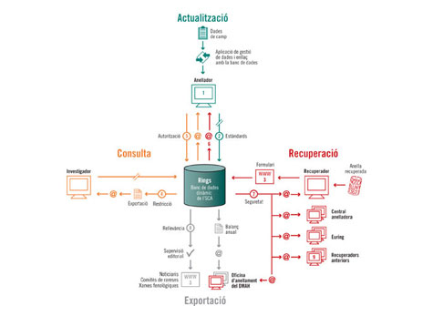 Ajornament del curs d'anellament al PNAE 11/9/2008 Degut a l'entrada de forta tramuntana que preveuen els serveis meteorològics per al proper cap de setmana (13 i 14 de setembre), l'SCA ha hagut d'ajornar el curs d'anellament programat per a aquestes dates. El curs s'organitzarà el cap de setmana següent (20 i 21 de setembre). El programa es manté intalterat en tota la resta. Les persones inscrites poden confirmar la seva assistència en aquestes noves dates a l'adreça info@rings.cat. Campanya d'anellament postnupcial a la Palma de Cervelló 7/9/2008 El passat dia 5 de setembre va començar la campanya d’anellament postnupcial a La Palma de Cervelló. El projecte, organitzat pel grup El Pèlac en col·laboració amb l'SCA, analitza el pas migratori de tardor a l'antiga finca de regadiu de Cal Sereno. S'anellarà un dia i mig a la setmana durant els mesos de setembre, octubre i novembre. La primera jornada va reportar 108 captures pertanyents a 24 espècies diferents, entre les quals destaca un exemplar de bosqueta icterina, Hippolais icterina. Les persones interessades a col·laborar-hi, amb o sense experiència prèvia en anellament, es poden posar en contacte amb el responsable de la campanya, Marc Pérez, a l'adreça hippolais20@hotmail.com. ![]() Rings: un banc de dades dinàmic 4/9/2008 Ja es pot descarregar l'esquema que proposa l'SCA per a la gestió telemàtica de les dades d'anellament, un sistema que integra els circuits d'actualització de registres, recuperació d'anelles, consulta i exportació de la informació, alhora que treu profit dels beneficis de la xarxa d'Internet: immediatesa i accesibilitat. Podeu enviar els vostres comentaris o suggeriments a l'adreça info@rings.cat. ![]() Jornada d'anellament a La Roca del Vallès 3/9/2008 ![]() Dins el marc del Dia Mundial dels Ocells, que se celebrarà el proper dia 4 d'octubre, l'SCA realitzarà una jornada d'anellament al municipi de La Roca del Vallès, oberta a tothom. L'activitat es durà a terme a la mateixa vila, a l'entorn del riu Mogent, des de primera hora del matí fins al migdia, i permetrà conèixer de prop les aus que hi viuen. Més informació: daniel.roca@rings.cat. Amb la col·laboració de: ![]() Tallarol xerraire a l'Empordà 31/8/2008 Aquest matí, en el marc del projecte de seguiment que es duu a terme als Estanys de Palau, dins Parc Natural dels Aiguamolls de l'Empordà, s'ha anellat un exemplar de tallarol xerraire, Sylvia curruca, en una jornada en què també s'ha capturat una bosqueta icterina, Hippolais icterina. Tots dos ocells eren joves de l'any. Observadors: Sergi Sales, Albert Roca i Àlex Ollé Cliqueu a les imatges per ampliar. Campanya d’anellament postnupcial a l’embassament de Cellers (Pallars Jussà) 22/8/2008 El passat dia 11 d’agost, per segon any consecutiu, va començar la campanya d’anellament d’ocells a la zona humida de l’embassament de Cellers, al Pallars Jussà. Està organitzada per l’associació naturalista Lo Trencalòs, i compta amb el suport econòmic de la Delegació Territorial del Govern a l’Alt Pirineu i Aran, i la col·laboració de l’Hotel Terradets. La campanya durarà un mes i mig, i cobrirà el període amb major activitat de la migració postnupcial dels ocells passeriformes en aquesta zona prepirinenca. A banda de conèixer quines espècies utilitzen el corredor fluvial de la Noguera Pallaresa en les seves migracions, es valorarà la importància d’aquest espai com a zona de repòs i alimentació dels ocells. Tots els anelladors i voluntaris que hi vulgueu col·laborar poseu-vos en contacte amb el responsable de la campanya, Marc Gàlvez, al telèfon 615 13 55 93, o al correu electrònic marcgalv@gmail.com. Formulari d'inscripció per als cursos de l'SCA 7/8/2008 Queden poques places per al curs programat al Parc Natural dels Aiguamolls de l'Empordà, els dies 13 i 14 de setembre, i ja comença omplir-se el curs que tindrà lloc al Parc Natural de la Muntanya de Montserrat els dies 11 i 12 d'octubre. Per tal de completar la inscripció, us recomanem que utilitzeu aquest formulari. Amb la col·laboració de: Suport institucional per al remitent català 2/8/2008 Dins de la tasca que duu a terme l'SCA per tal d'aconseguir suport institucional per al remitent català, representants de l'associació es van reunir amb el Conseller de Medi Ambient i Habitatge, Francesc Baltasar, el passat dia 1 de juliol. Durant la trobada, a la qual també va assistir la Directora General de Medi Natural, Núria Bonaventura, es va constatar l'interès del Departament per l'ús del remitent català per a l'anellament. A l'espera que comencin les reunions per tal d'avançar cap a una fórmula de consens entre les diferents entitats dedicades a l'anellament, el Conseller va expressar el compromís de publicar una resolució que permeti l'SCA operar amb el seu remitent sense cap limitació pel que fa a la naturalesa dels projectes. Segons ens ha informat recentment la Directora General de Medi Natural, aquest comunicat s'emetrà a principis de setembre. Podeu enviar les vostres notícies d'anellament a info@rings.cat |
